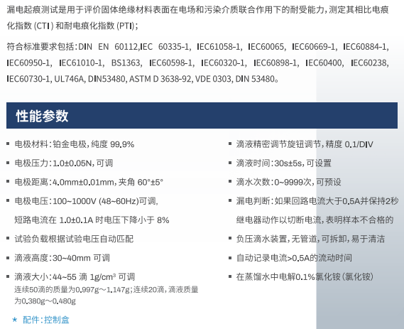 漏電起痕測(cè)試是用于評(píng)價(jià)固體絕緣材料表面在電場(chǎng)和污染介質(zhì)聯(lián)合作用下